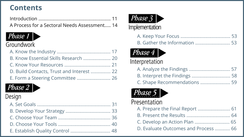 Sectoral Needs Assessment: A Process for Essential Skills Analysis provides one of the earliest comprehensive approaches to linking essential skills research with workforce planning. It outlines a structured process for gathering and interpreting data to understand the real skill needs of an industry—helping employers, educators, and policymakers make informed decisions about training and development. The guide remains a valuable reference for organizations conducting labour market or workforce research. While Canada’s framework has evolved from Essential Skills to Skills for Success, the principles and processes in this guide—such as stakeholder engagement, data collection, and translating findings into action—remain foundational to any skills analysis. Developed in 2000 with funding from the National Literacy Secretariat of Human Resources Development Canada and Alberta Learning.
